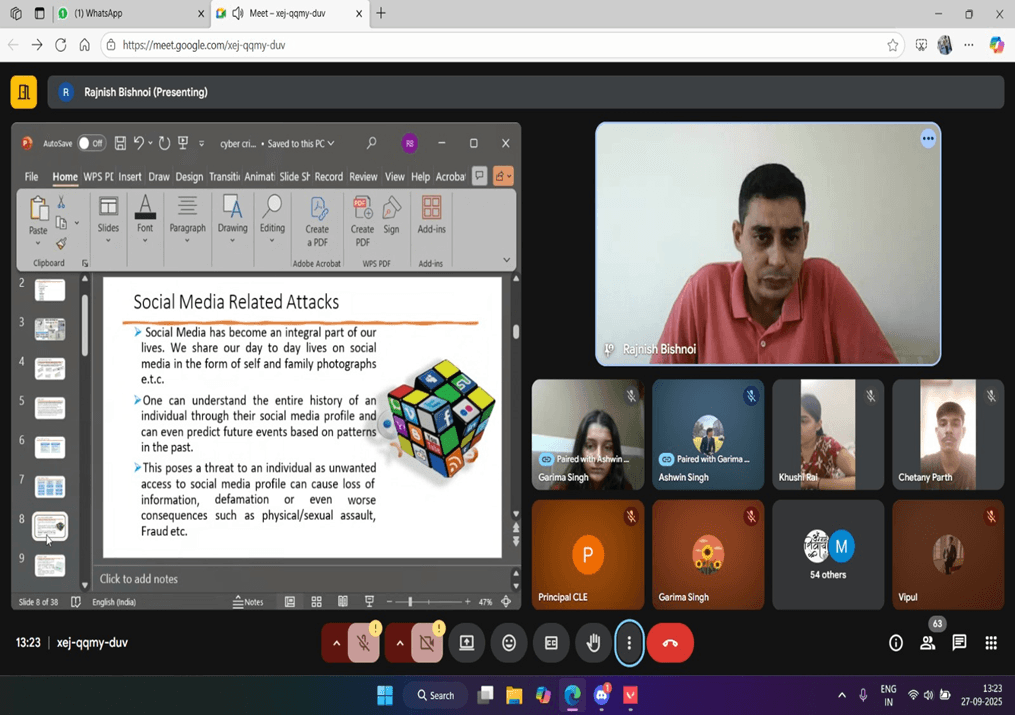 The session highlighted the sociological factors contributing to cyber deviance, including anonymity in digital spaces, peer influence, and the growing dependence on technology. Dr. Bishnoi emphasized that cybercrime is not only a technological issue but also a social concern that requires awareness, ethical responsibility, and a multidisciplinary approach to address effectively.
