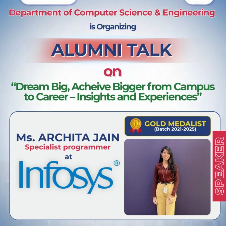 “DREAM BIG ACHIEVE BIGGER FROM CAMPUS TO CAREER- INSIGHT AND EXPERIENCES” Organized By: Department of Computer Science & Engineering, ADGIPS DelhiIn Association With: —Date: March 16, 2026 | Mode: Offline | Time: 10:00amEvent Coordinator: Dr. Nitin, Associate Professor, CSE Department Ms. Rekha, Assistant Professor, CSE Department Guest Speakers: Ms. Archita Jain specialist programmer…