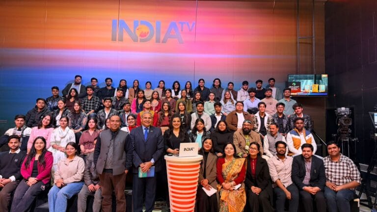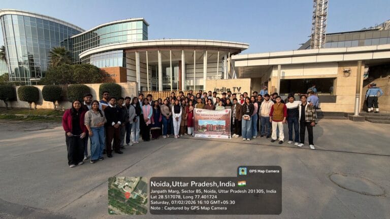 An educational visit to the India TV Broadcast Centre in Noida was organized for students of BA LL.B. and BBA LL.B. to provide practical exposure to the functioning of a television news channel. The visit aimed to familiarize students with the production and broadcasting process of television debate programmes and the role of media in shaping public discourse.