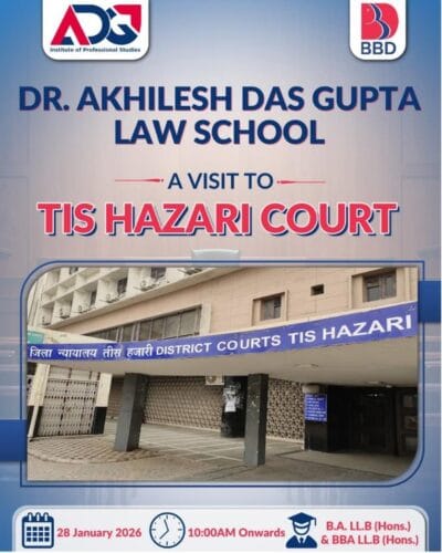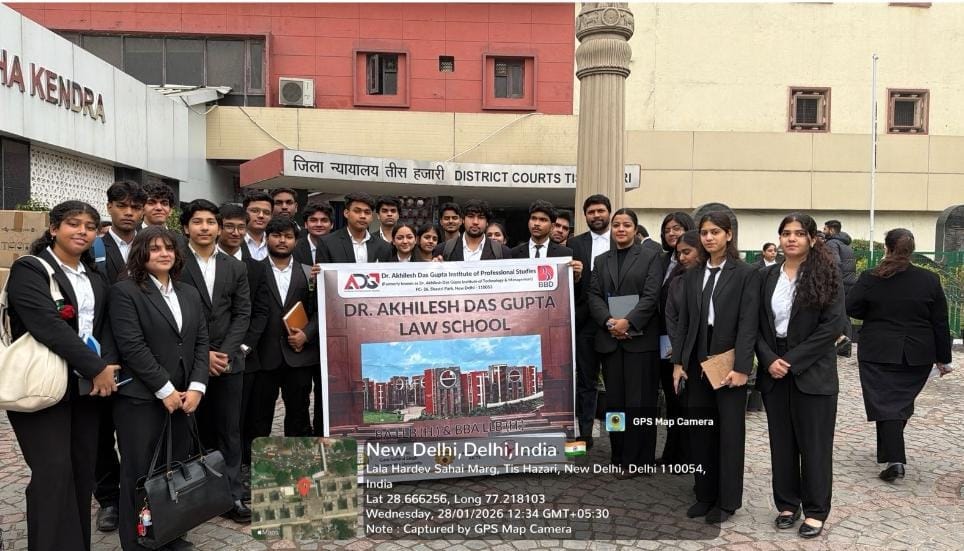 Students First Year from ADG Law School, ADGIPS visited Tis Hazari Court, Delhi, as part of an academic initiative to gain practical exposure to the functioning of the judicial system.As one of the oldest and busiest district courts in Delhi, the court complex handles a wide range of criminal, civil, and special matters. During the visit, students observed proceedings in both the Old Building and the Extension Building, gaining first-hand insight into various cases, including bail matters, serious criminal trials, cheque bounce cases under the Negotiable Instruments Act, and Motor Accident Claims Tribunal (MACT) matters.