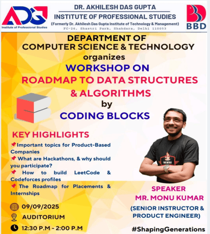 Poster announcing the “Workshop on Roadmap to Data Structures & Algorithms”, organized by the Department of Computer Science & Technology in collaboration with Coding Blocks. The poster highlighted key learning areas such as DSA topics for product-based companies, hackathons, and building coding profiles for placements.